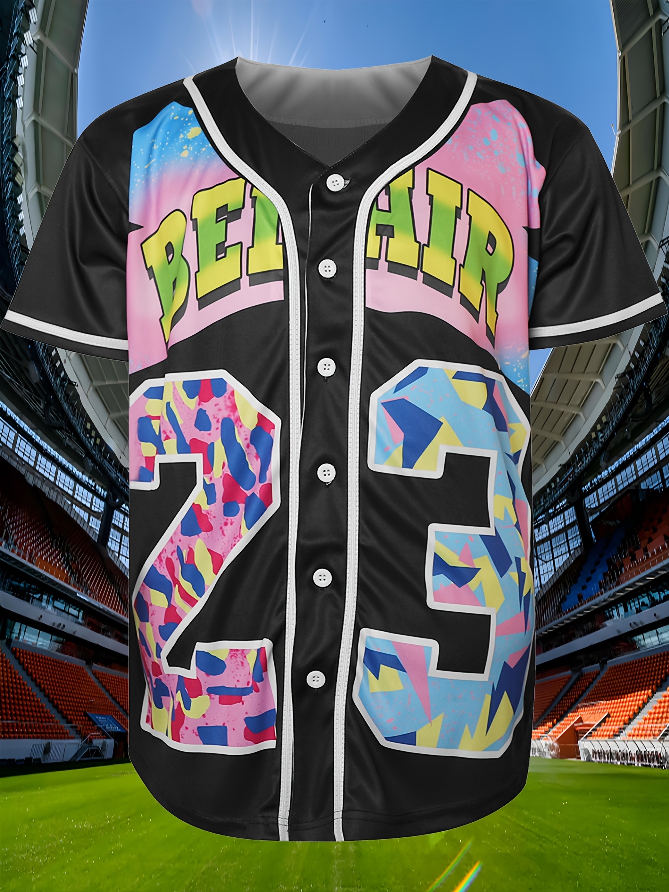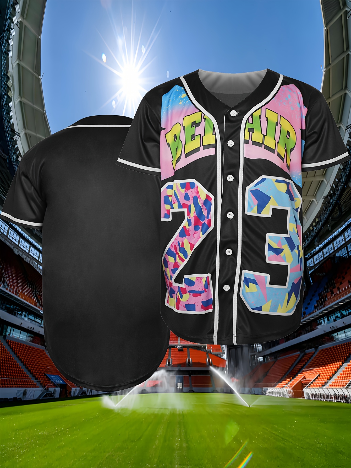 Men's #23 "Bearfair" Embroidered Baseball Jersey - Breathable Polyester V-Neck, Colorful Patchwork Design, Ideal for Sports & Casual Wear, Spring/Summer/Fall, Sizes S-XXXL