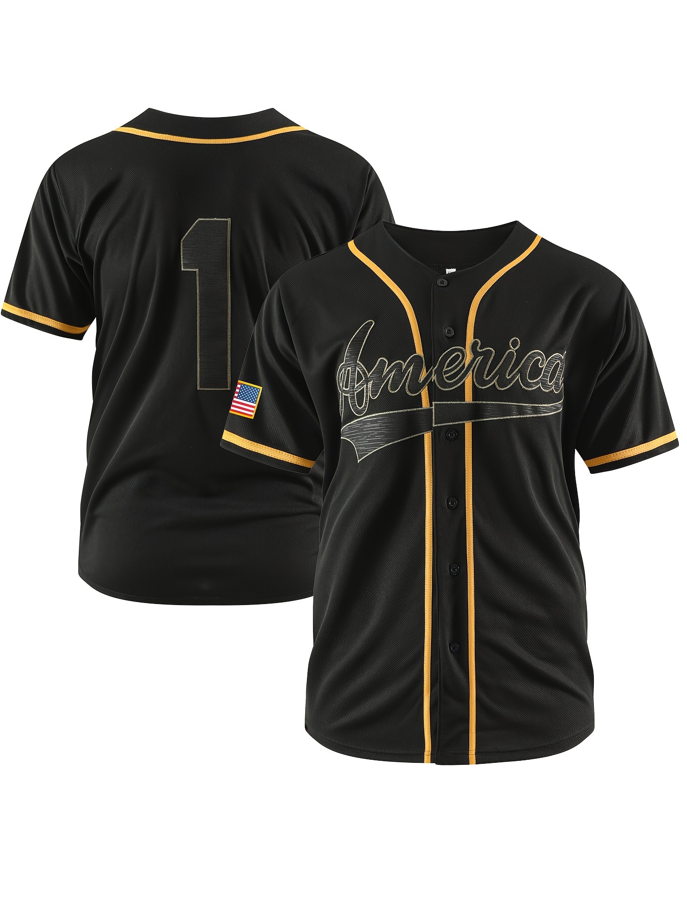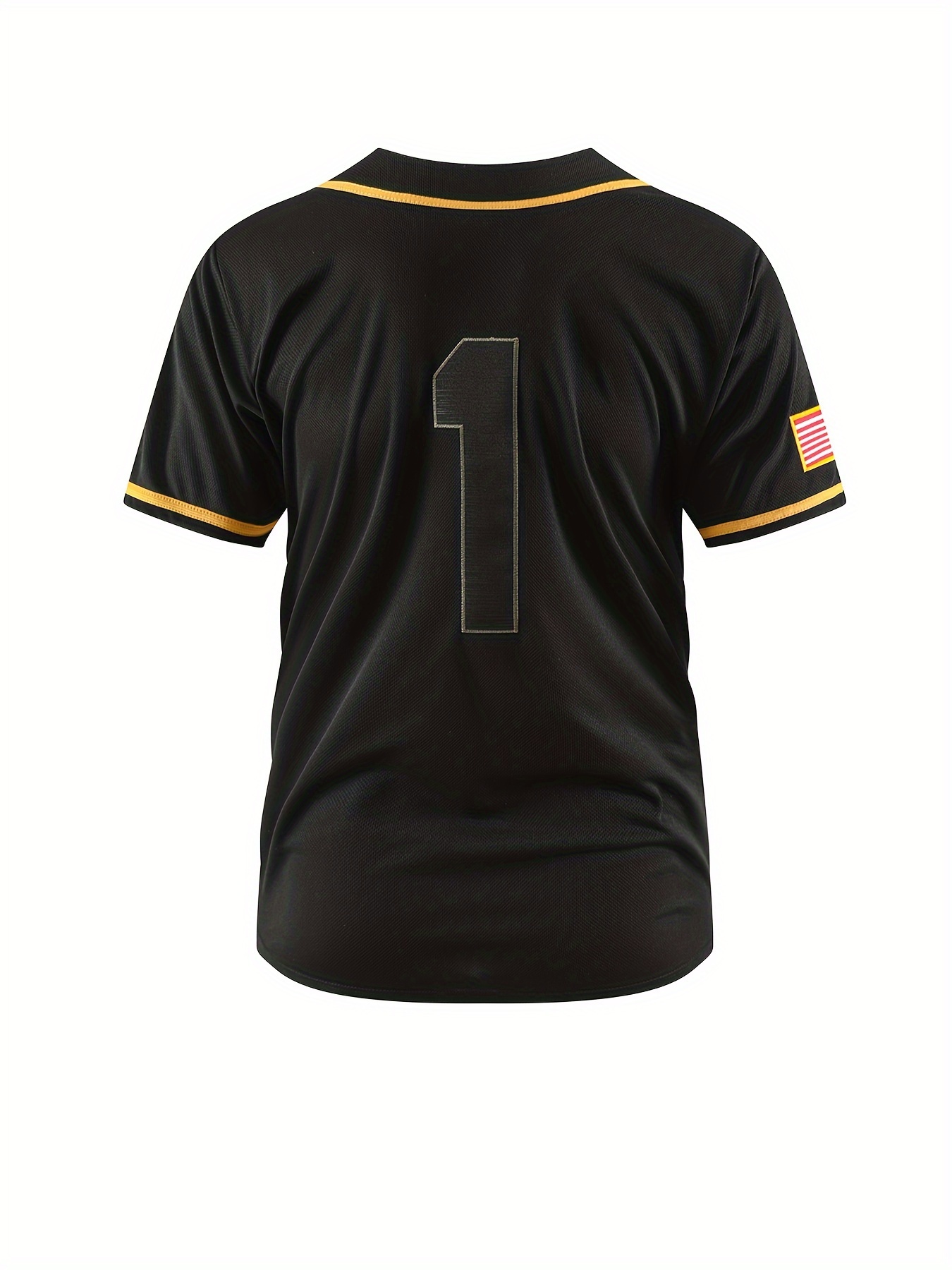 Men's #1 Black Baseball Jersey with Golden Embroidery - Breathable, Sporty V-Neck, Casual & Streetwear Style, Polyester, Machine Washable for All Seasons