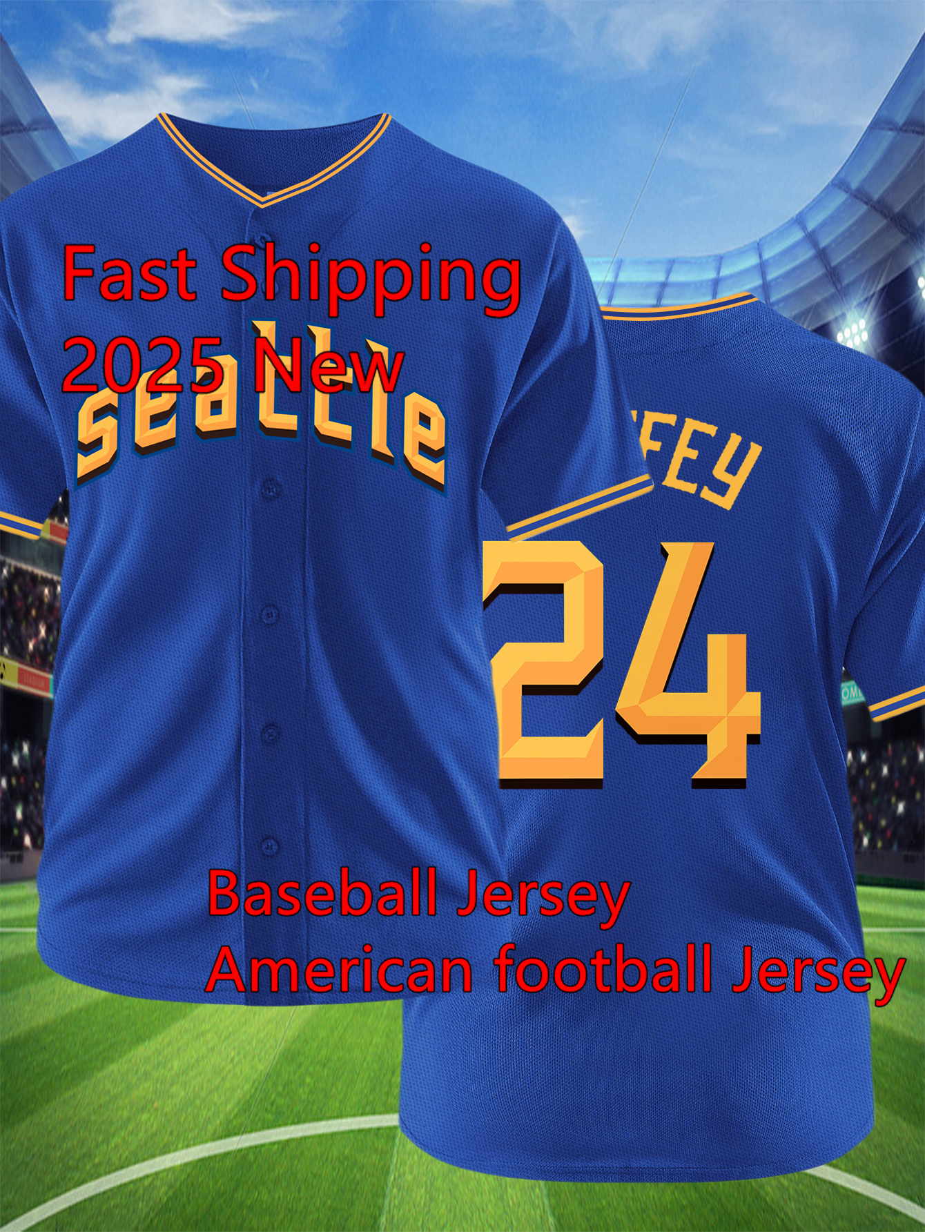 Men'S Blue # 24 Baseball Shirt, Classic Letter Embroidery Design, Breathable Button style Short Sleeve Shirt, Used for Training and Competition