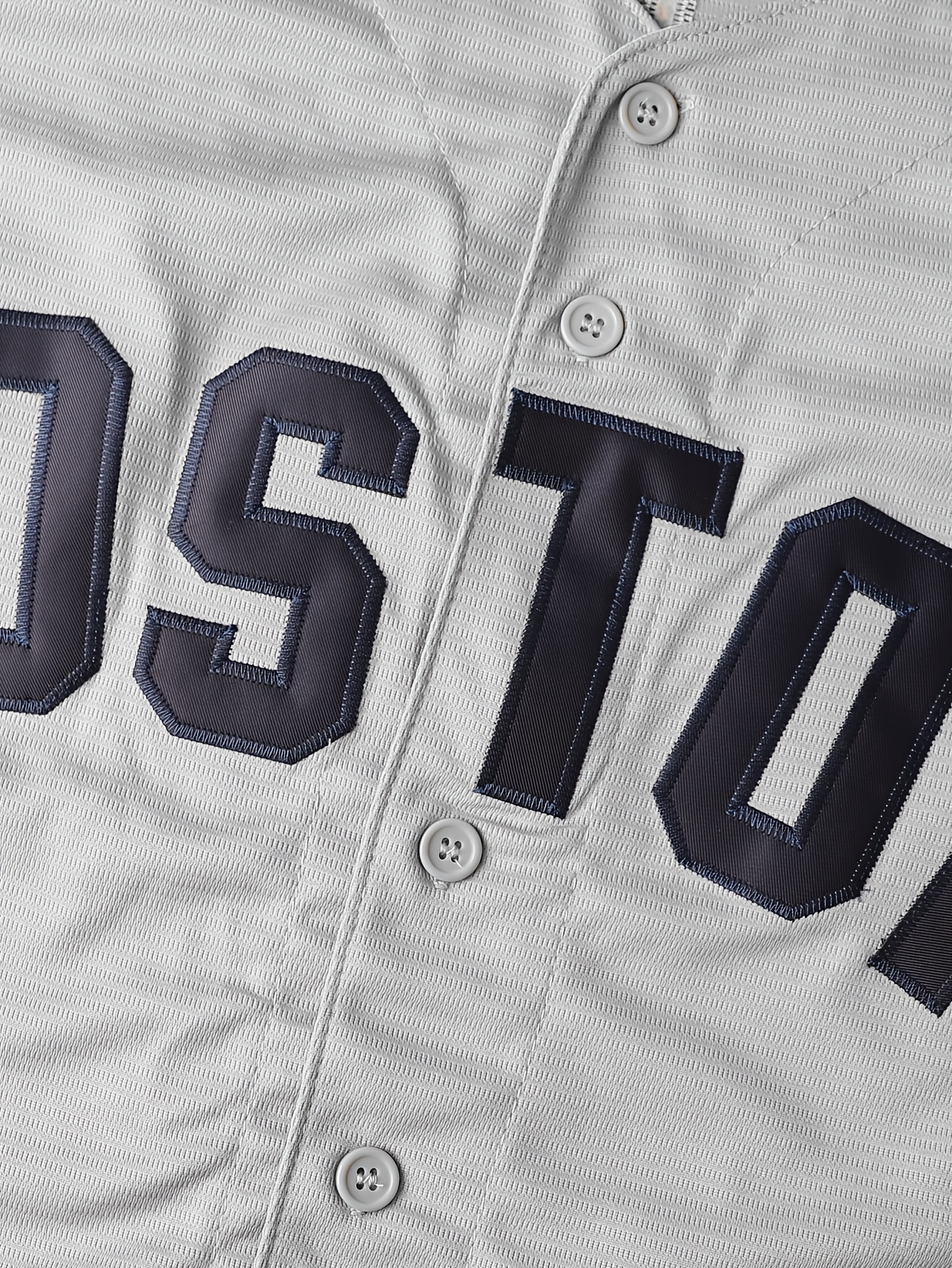 Men's Breathable Gray Baseball Jersey with Embroidered 'Boston' & Number 9V Collar - Loose Knit Polyester Sportswear for Team Sports, Beach, Casual Wear (Sizes S-3XL), Outdoor Activity Apparel, Embroidered Detailing